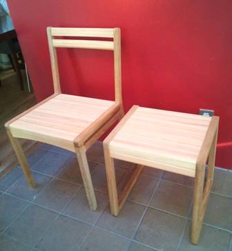 にっぽんの木でつくった家具」シリーズの一つ 「MOROTSUKA」は、しいたけ用原木としては大きくなりすぎた宮崎県諸塚村のコナラを活用している。イスの背と座面はヒノキ。 |
