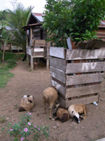 | 写真 左) よく見られる旧式の家 写真中央) コーヒー豆を干している 写真 右) 山羊や鶏があちこちにいる 写真右下) 村の風景 |