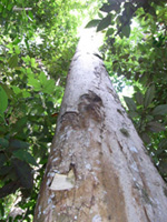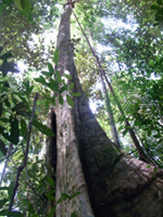 1時間近く歩くと、そびえ立つ美しい木々が森を形づくりはじめました。村人が次々と商業価値のある木の名を誇らしげに指さしながら教えてくれました。木の種類は、マランティ、マダン、バラム、プライ、マサラなど10種類以上にもなりました。私はこうした森林を歩ける幸運を感じながら、生物多様性豊かなこの森林を一瞬にして伐採・植林し、モノカルチャー(単一種の栽培)の世界にすることによって失われる価値の大きさに圧倒されるばかりでした。この森はスマトラトラなどの絶滅危惧種の野生生物の重要な生息地であることは言うまでもありません。