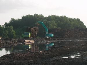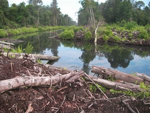 | 植林地を造成するために破壊された泥炭林。April社関連会社による開発。水抜きのため運河を掘削するが、このとき大量の温室効果ガスが発生する。 (リアウ州スンガイトホールにて2010年6月撮影) |